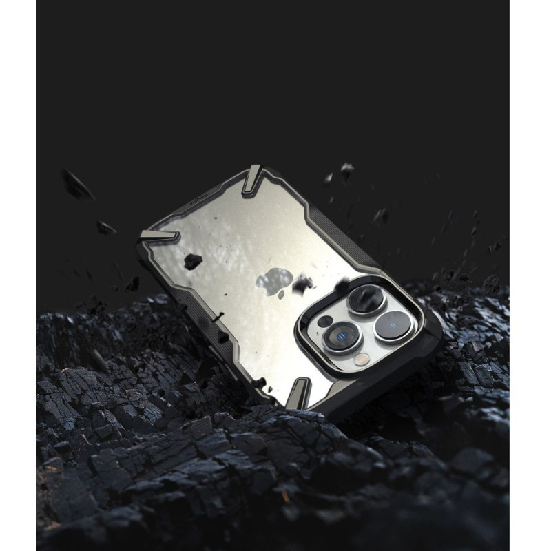 iPhone 14 Pro.Mustade servadega silikoonümbris ,tagumine osa on läbipaistev plastik